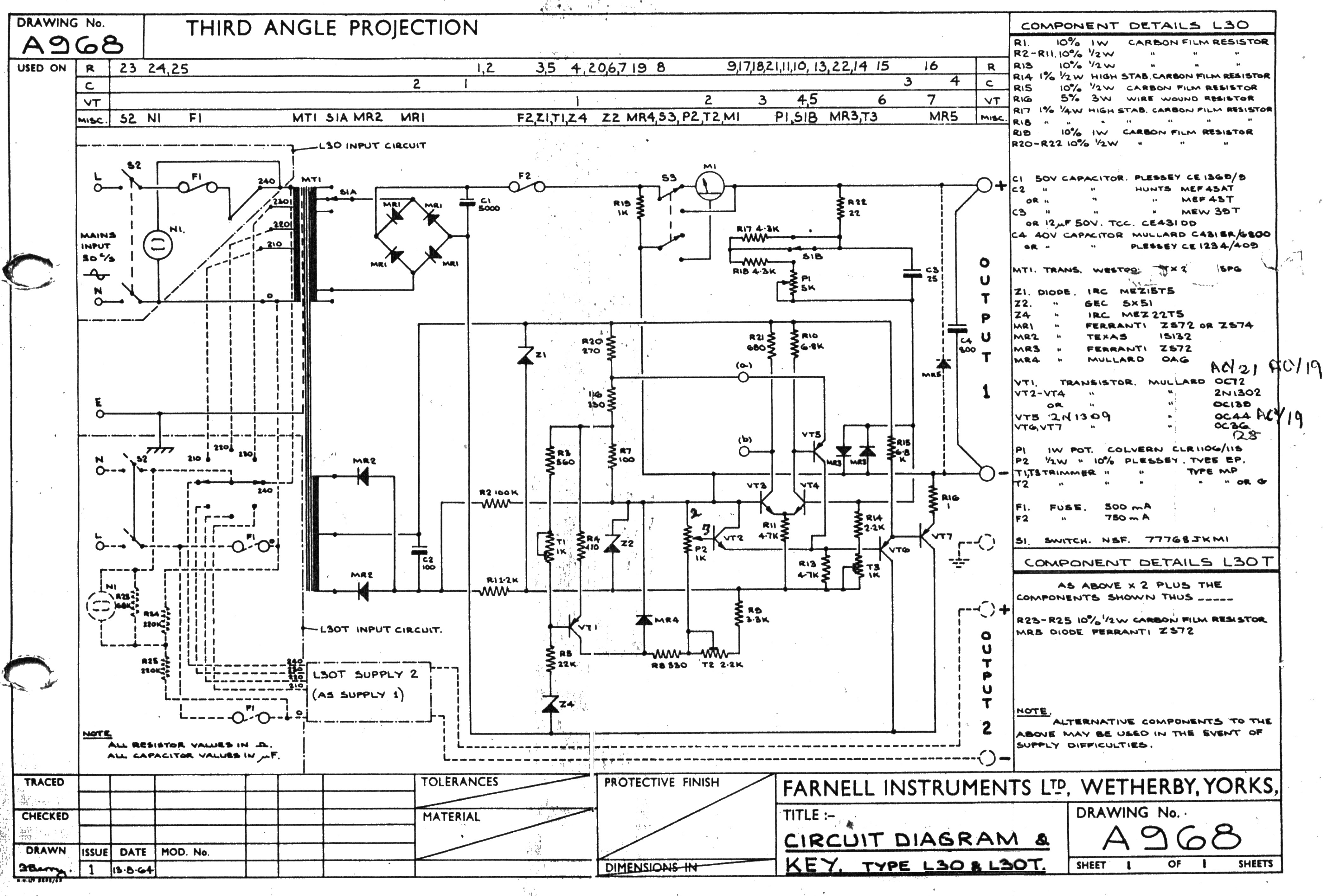 The L30 may have been the first production model laboratory bench supply from Farnell and appears to be based on an earlier DC supply unit, the PSO 30/2, described as being "constructed for use as a sub-unit in other equipment. Hank bushes are incorporated to allow fixing to panels or chassis". I do not know if these were open-frame or enclosed units. They were introduced in 1961 and the schematic and specification are the same as the L30 but without the metering and current limit, using three OC36 in a Darlington configuration.
