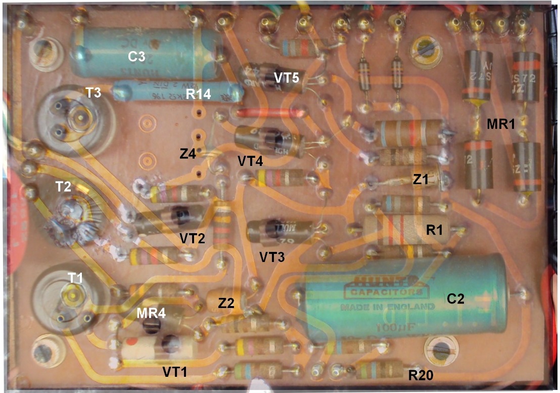 The devices used were changed during the production period: VT1 was OC72 or ACY19 or 21, VT2-4 were OC139 or 2N1302, VT5 was 2N1309 or OC44 or ACY19, VT6-7 were OC36 or 28.
