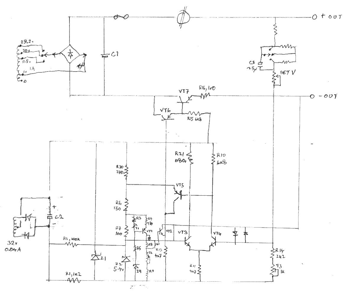 A pair of OC36 power devices is used for a Darlington-pair common collector output, maintained by the control circuit on a single-sided PCB, operating from a 20V power line regulated by Z1. Z2 provides the 5.4V reference voltage for long-tail pair VT3+4. VT1+2 provide the current limiting