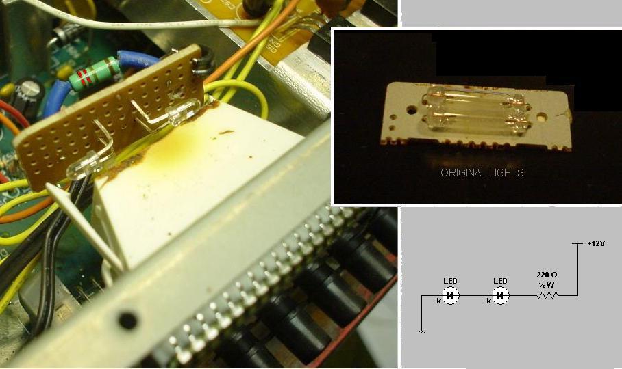 The display bulbs were failing, so I took the opportunity to replace them with white LEDs, two in series with a resistor - about 220ohms gives a bright display